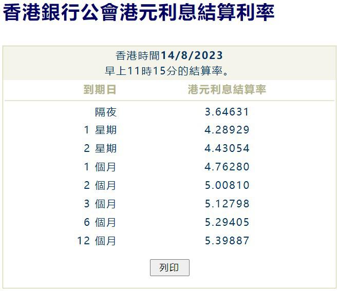 港元拆息普遍反弹隔夜息报3.65%创近一周新高