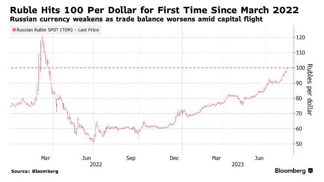 尽管俄罗斯央行试图在2023年剩余时间停止在国内市场购买外汇来遏制卢布的暴跌,但美元兑卢布汇率在周一仍突破了100的重要心理关口,这是自去年3月以来的首次。