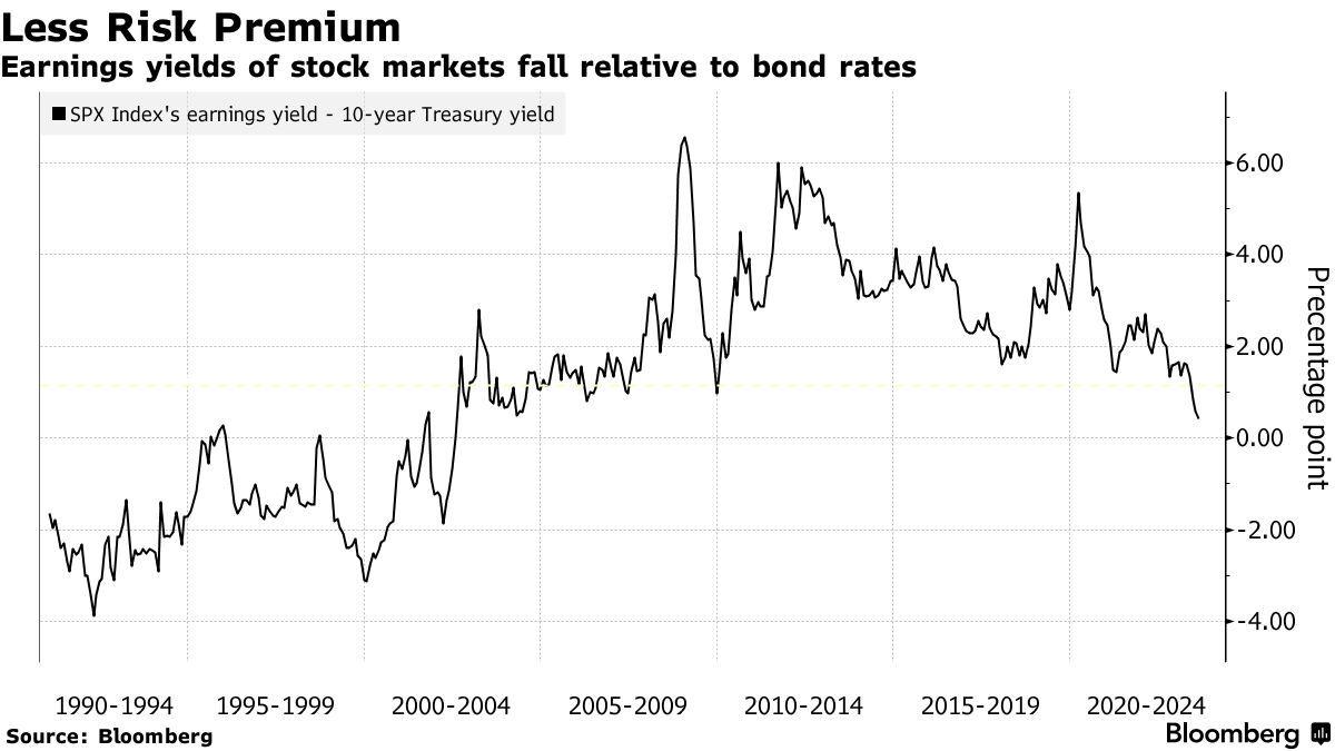 至于美股市场,格罗斯表示,以企业盈利收益和债券收益率之差衡量的股票风险溢价处于历史低位,这表明美股整体估值太高了。