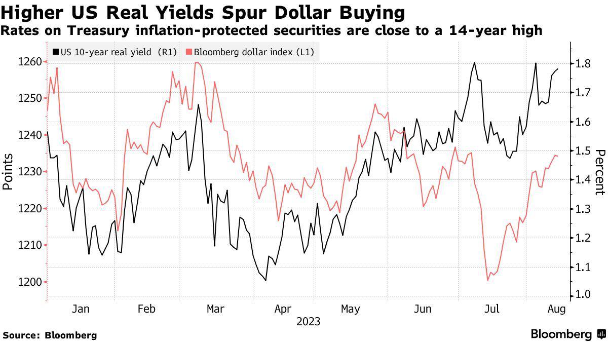 通常来说,10年期美债收益率和美元之间通常呈现一定程度的正相关关系。这意味着当10年期美债收益率上升时,实际收益率往往也会走高,美元汇率也将随之上升,反之亦然。这种关系主要是由于利率导致的收益率差异和资本流动的影响。