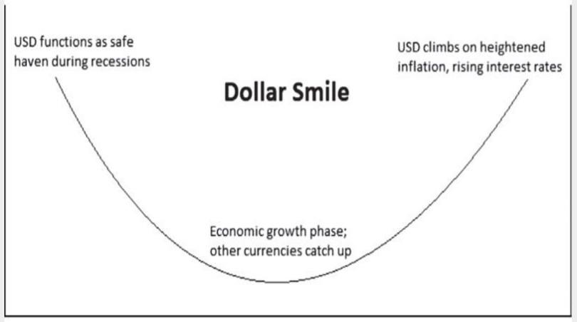 知名分析师Stephen Jen于2001年在摩根士丹利担任策略师期间与他所领导的团队创立了“美元微笑理论”(Dollar Smile Theory)。该理论的重点内容为:当美国经济非常强劲,或者非常疲弱时,美元往往会走强,而在美国经济增长中等甚至放缓时,以及全球广泛增长期间,美元则会下跌;一个国家的货币往往在经济低迷时期贬值,但是美元独特的全球地位使得美国经济即便表现不佳,美元仍有可能大幅上行。