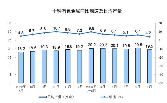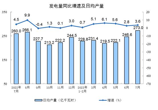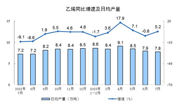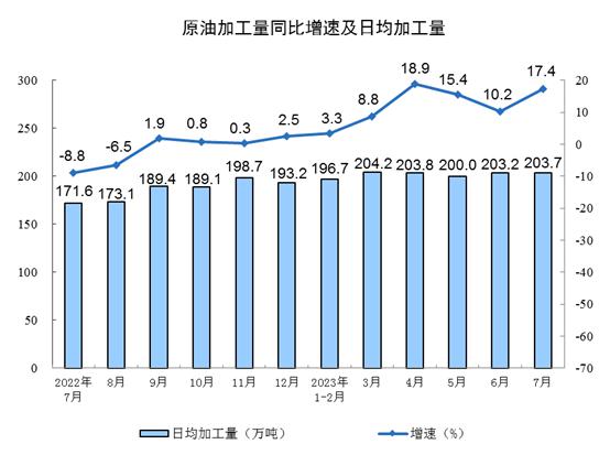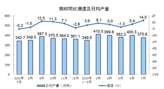 分产品看,7月份,620种产品中有303种产品产量同比增长。钢材11653万吨,同比增长14.5%;水泥17618万吨,下降5.7%;十种有色金属603万吨,增长4.2%;乙烯241万吨,增长5.2%;汽车232.4万辆,下降3.8%,其中新能源汽车75.2万辆,增长24.9%;发电量8462亿千瓦时,增长3.6%;原油加工量6313万吨,增长17.4%。
