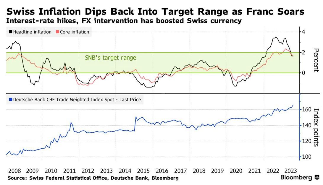 从许多方面来看,瑞士通过支撑瑞郎来对抗输入性通胀的实验是成功的。但现在交易员面临的问题是,瑞郎的涨势能否持续。此前,瑞郎的贸易加权汇率大幅飙升,因为瑞士央行提高了利率,并干预外汇市场,将通胀控制在目标范围内。现在,从富国银行到巴克莱银行的策略师都警告说,如果瑞士央行放缓甚至停止在外汇市场上购买瑞郎,瑞郎的强势可能见顶。交易员和投机者也越来越看空瑞郎。