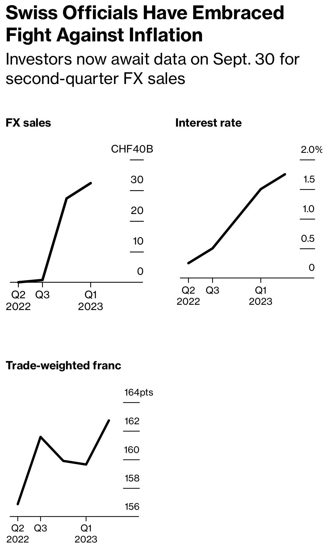 然而,货币政策重大转变的时机仍不明朗。经济学家预计,瑞士央行将在9月份最后一次加息,尽管通胀放缓的速度预计将快于该央行的预期。官员们尚未就干预汇率的计划给出任何明确的指导,不过他们将在9月30日公布第二季度外汇销售数据。