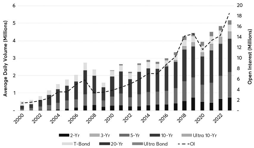 综上所述,美联储预计利率将会更长时间维持较高水平,未来继续大规模加息的可能性很小,但是也不大可能很快转向降息。由于美国财政部发债融资需求攀升、实际通胀回落缓慢、美国经济保持韧性,美债收益率在较长时间内维持较高水平,直至经济走弱才会回落,投资者可以考虑运用芝商所10年期美国国债期货合约(产品代码:ZN)进行风险对冲。在净发行量增加和经济事件不确定性的情况下,对可靠、高流动性的利率风险管理的需求正在推动美国国债期货的资金流入创历史新高。今年以来未平仓合约飙升30%,达到创纪录的1,850 万份合约,同比增长41%。