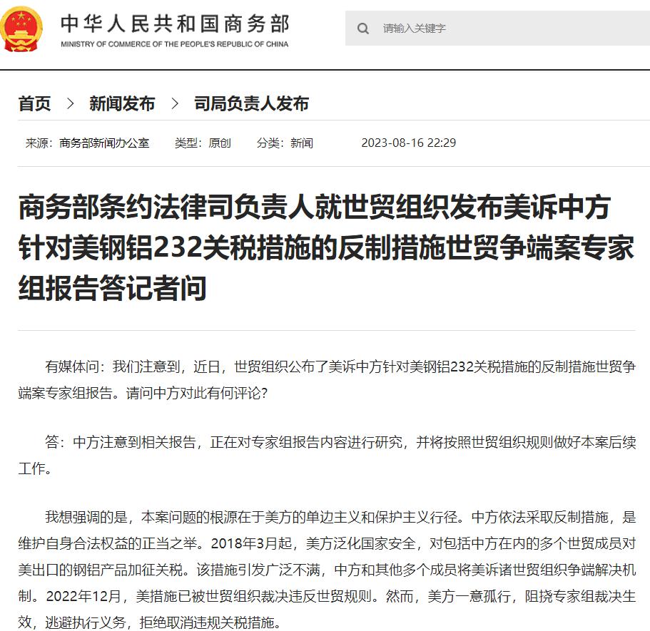 商务部条约法律司负责人就世贸组织发布美诉中方针对美钢铝232关税措施的反制措施世贸争端案专家组报告答记者问:中方依法采取反制措施,是维护自身合法权益的正当之举。中方要求美方立即取消违反世贸规则的钢铝232措施,与其他世贸成员相向而行,共同维护以规则为基础的多边贸易体制。