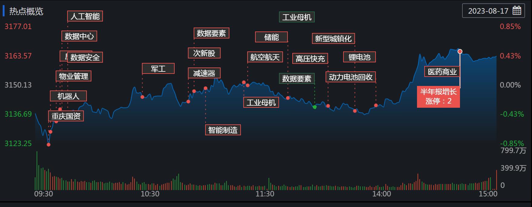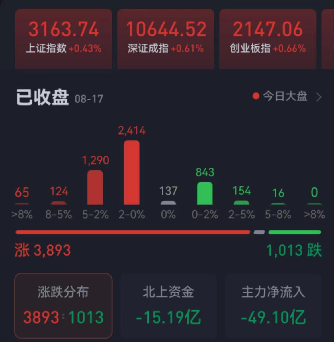 周四(8月17日),A股三大股指震荡上行,全线飘红。截至收盘,上证指数涨0.43%报3163.74点,深证成指涨0.61%报10644.52点,创业板指涨0.66%报2147.06点。两市合计成交金额7398.19亿元,北向资金净卖出15.19亿元。总体上看,两市个股涨多跌少,近4000只个股上涨。其中,涨停个股达43只,跌停个股1只。