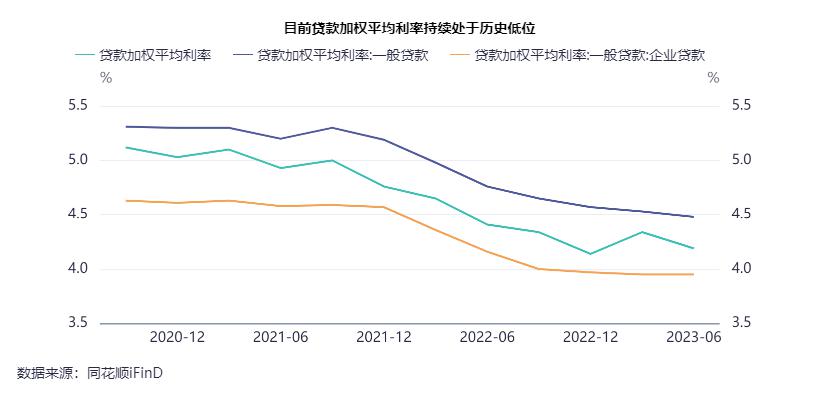 “6月,新发放贷款加权平均利率为4.19%,同比下降0.22个百分点。其中,一般贷款加权平均利率为4.48%,同比下降0.28个百分点,企业贷款加权平均利率为3.95%,同比下降0.21个百分点,均处于历史低位。”