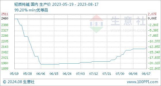 8月17日,生意社轻质纯碱基准价为2122.00元/吨,与本月初(2060.00元/吨)相比,上涨了3.01%。