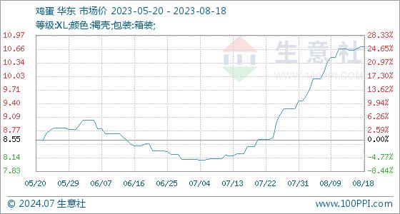 8月18日,生意社鸡蛋基准价为10.71元/公斤,与本月初(9.45元/公斤)相比,上涨了13.33%。