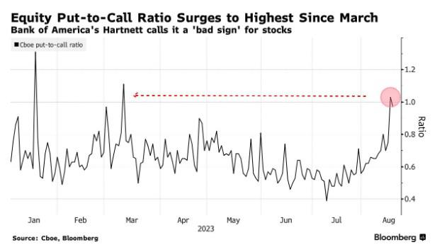 周三,芝加哥期权交易所的股票看跌期权和看涨期权之间的比率一度飙升至1以上,达到3月份银行业动荡以来的最高水平,这一迹象表明,由于投资者预计个股波动性将加大,他们正在加大对冲保护力度。Hartnett表示,如果股市无法维持在当前水平,这将是一个“不好的迹象”。