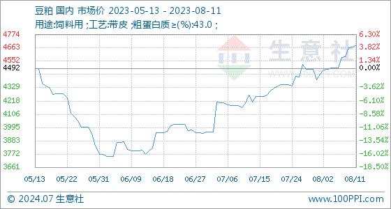 8月11日,生意社豆粕基准价为4672.00元/吨,与本月初(4398.00元/吨)相比,上涨了6.23%。