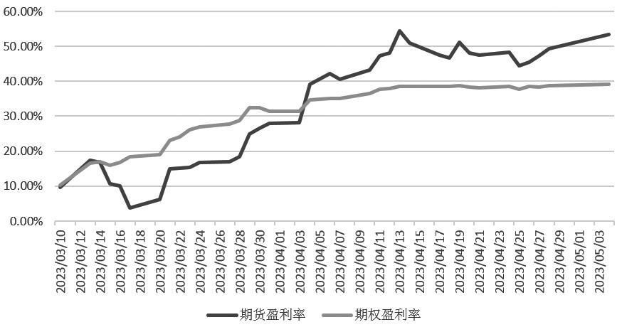 通过波动率我们可以看出,白银相对黄金波动率偏高,因此我们选择卖出沪银看跌期权,同时采用买入沪金看跌期权来进行交易。配比按照期货合约价值1:5.5进行,选择平值期权合约进行套利,同时买入10手AU2306P420,卖出55手AU2306P5000,进行持仓。