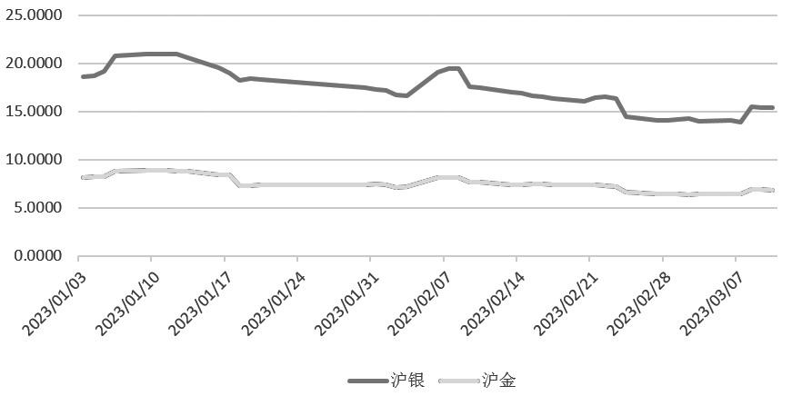 以2023年3月10日到5月5日期间内盘金银比数据为例,由于此前受疫情影响,避险属性推动金银比持续走高,而后随着市场避险情绪逐渐减弱,金银比开始回落至正常水平,在此期间利用黄金白银期权进行套利,并与利用期货效果进行对比。
