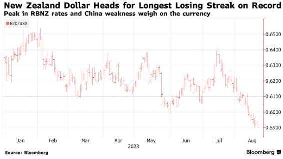 新西兰央行连续第二次会议决定维持利率不变,令该国货币承压,同时其他国家的政策制定者正在考虑进一步加息。贸易商还担心中国经济的影响,中国是新西兰最大的贸易伙伴。自本月初以来,新西兰元兑美元的表现一直落后于10国集团(十国集团)的其他货币,下跌了近5%。