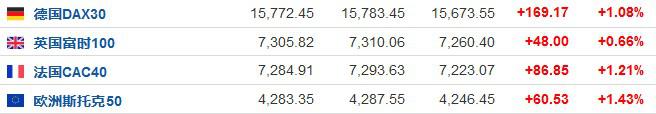 2.截至发稿,德国DAX指数涨1.08%,英国富时100指数涨0.66%,法国CAC40指数涨1.21%,欧洲斯托克50指数涨1.43%。