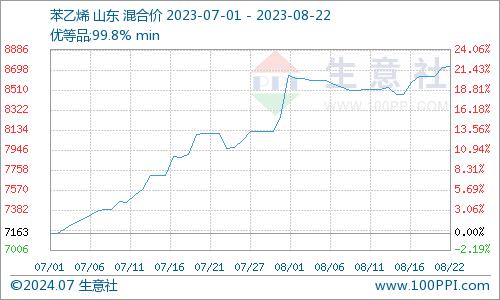 据生意社商品行情分析系统显示,8月22日苯乙烯市场行情下跌。山东苯乙烯价格8730.00元/吨,较上一交易日上涨0.06%,同比下跌2.79%。 国际油价下跌,成本支撑不佳,抑制了苯乙烯涨幅。近期下游需求不佳,采购乏力,预期短时苯乙烯现货市场以小幅下跌为主。
