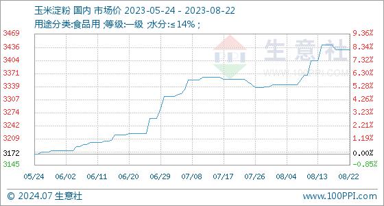 8月22日,生意社玉米淀粉基准价为3430.00元/吨,与本月初(3344.00元/吨)相比,上涨了2.57%。