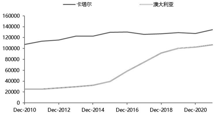 图为卡塔尔和澳大利亚天然气出口量(单位:百万立方英尺)