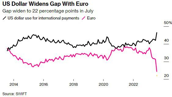美元在Swift交易中所占份额的不断增加,在很大程度上是以欧元为代价的,欧元在2012年的份额达到了46%的峰值。上个月,欧元在交易中的份额降至历史最低水平,略低于四分之一。