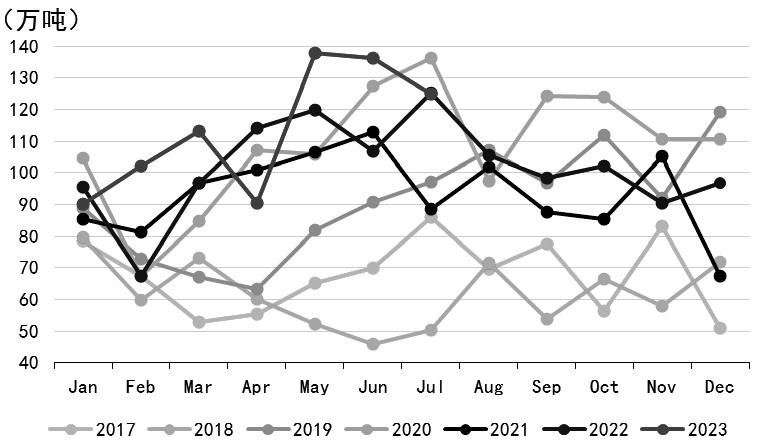 海外供应方面,8—9月进口压力较大。由于伊朗发货水平及外盘装置开工尚可,自二季度后期开始,我国甲醇进口量水平明显抬升。截至7月,我国甲醇进口125万吨,环比下降8.31%,同比下降0.12%;1—7月累计进口795万吨,较去年同期增长9.54%。虽然近期个别伊朗装置临停,但基于5—7月类似情况时有发生,最终未对伊朗发货量产生较大影响,预计8—9月仍维持月均进口约130万吨上下的水平。另外,特立尼达和多巴哥因原料问题而停车的部分产能已恢复,预计对9月进口影响有限,或影响10月进口体量。