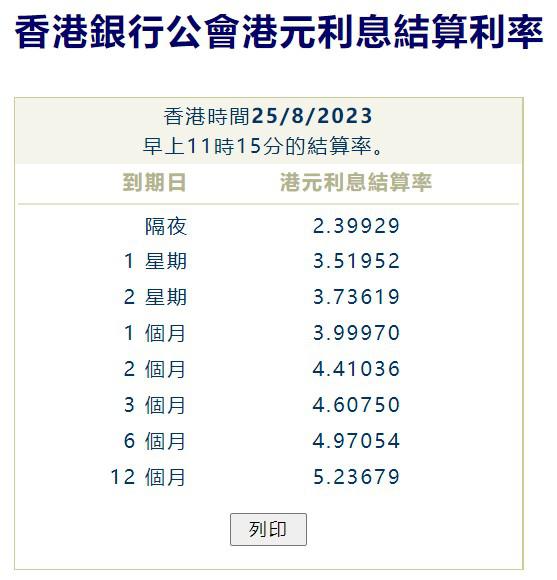 8月25日,港元拆息连续两日全线下跌,其中,隔夜息进一步跌至2.39929%,创逾十一周新低,而与楼按相关的一个月拆息亦连跌九天,并跌穿4%,低见3.9997%,为5月9日以来最低。