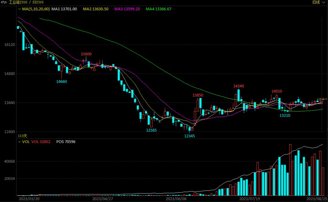 上周工业硅期货价格振荡上行,价格相对强势,主力合约SI2310收获四根阳线,收于13795元/吨,周涨幅为1.96%,价格上涨幅度不大但近乎单边上涨。其中,持仓量增加4524手至70596手,成交量增12997手至22.1万手,品种热度提升。现货方面,据中国有色金属工业协会硅业分会数据,上周工业硅价格整体持稳,仅部分牌号和地区的价格上涨100—200元/吨,冶金级主流价格在13000—141000元/吨,化学级主流价格在14000—15200元/吨。