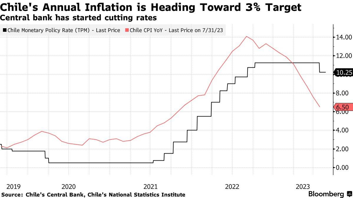 此外,智利的年通货膨胀率从2022年超过14%的峰值大幅下降,7月份降至6.5%。该央行密切关注的一项核心价格指标已逐渐放缓,较上年同期上涨8.5%。