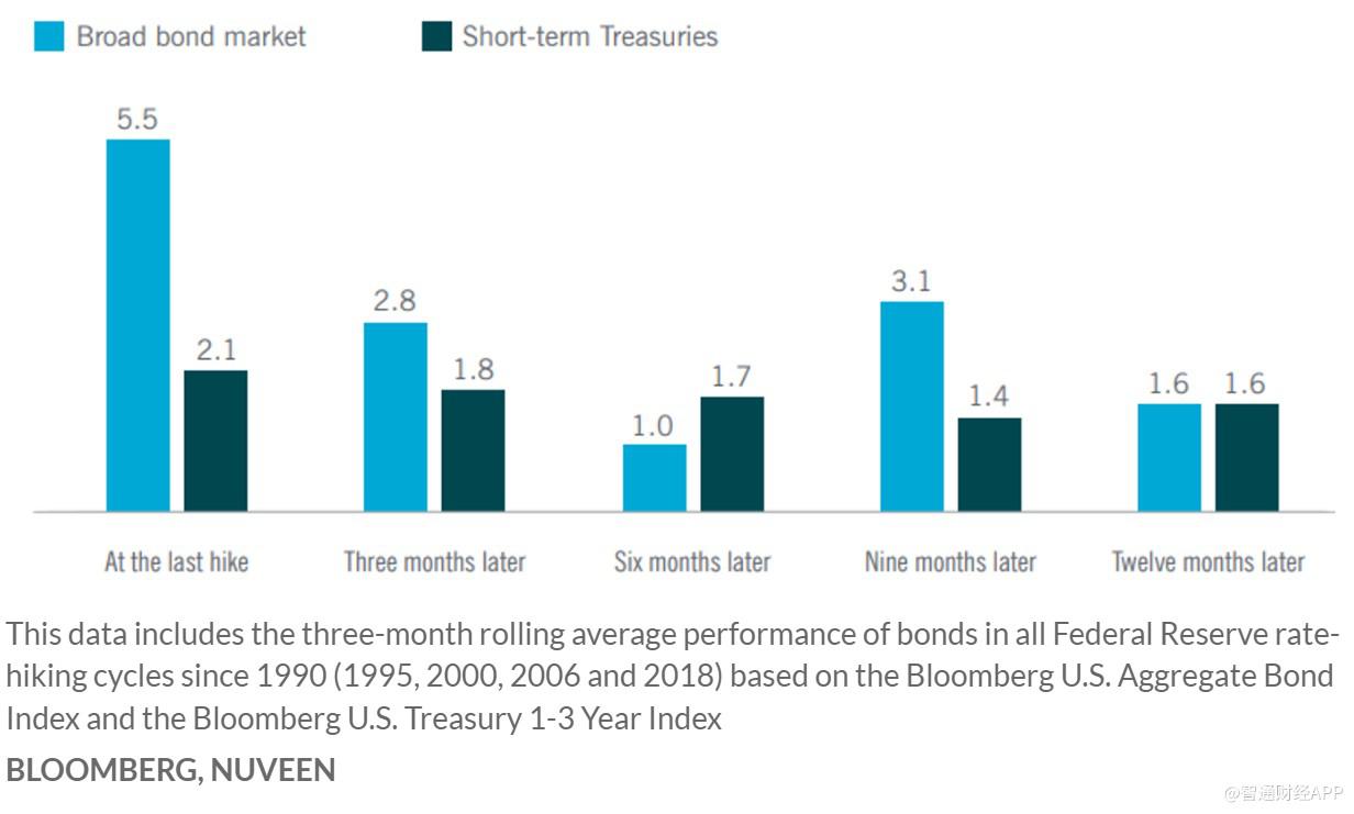 在过去的四次美联储加息周期中,债券市场在最后一次加息后的三个月内平均回报率为5.5%,而短期国债的回报为2.1%。