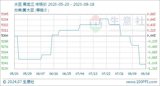 8月18日,生意社大豆基准价为5240.00元/吨,与本月初(5324.00元/吨)相比,下降了-1.58%。