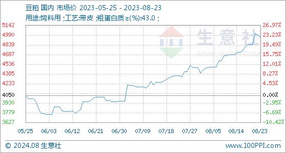8月23日,生意社豆粕基准价为4994.00元/吨,与本月初(4398.00元/吨)相比,上涨了13.55%。