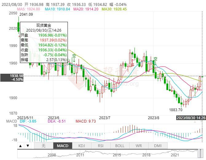 随着投资者因经济数据疲弱而减少对美国进一步升息的押注,周三,金价徘徊在三周高位附近。截至发稿,现货黄金持平于每盎司1936.25美元,较周二触及的8月7日以来最高水准低约2美元。美国黄金期货稳定在每盎司1,964.20美元。