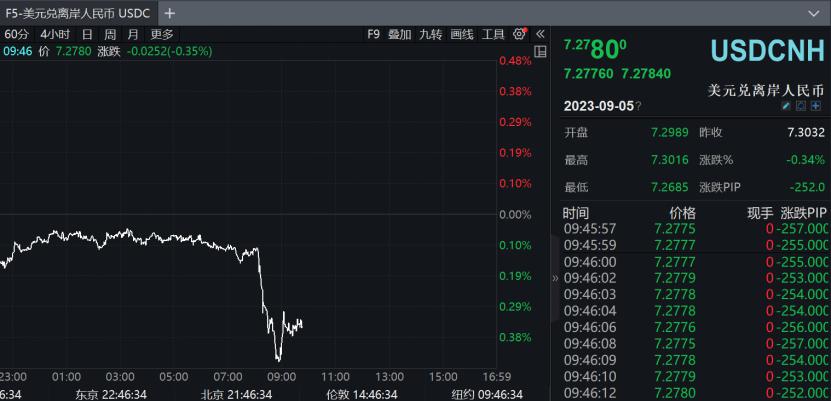 受上述一系列利好消息刺激,8月31日晚间,离岸人民币兑美元一度飙涨超300点。截至券商中国记者发稿,离岸人民币兑美元报7.2780,上涨252点。