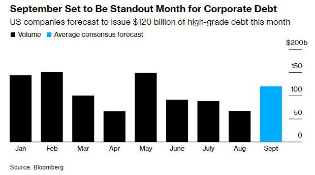 一项针对承销这些交易的银行家的调查预测,9月份将发行1200亿美元的美国债券,其中大部分预计将在未来几天内发行。