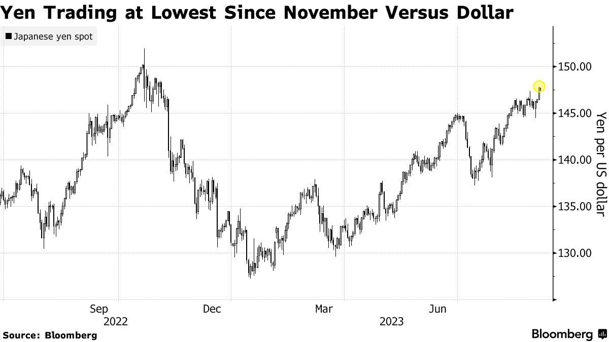 “日元一夜之间突然下跌超过1日元,这其实已经增加了人们对日本政府口头干预的预期。”Monex Inc.债券和外汇市场交易员Tsutomu Soma表示。“不过,预计距离实际干预还有一段时间。市场参与者们可能认为150重要关口是非常重要的心理点位。”