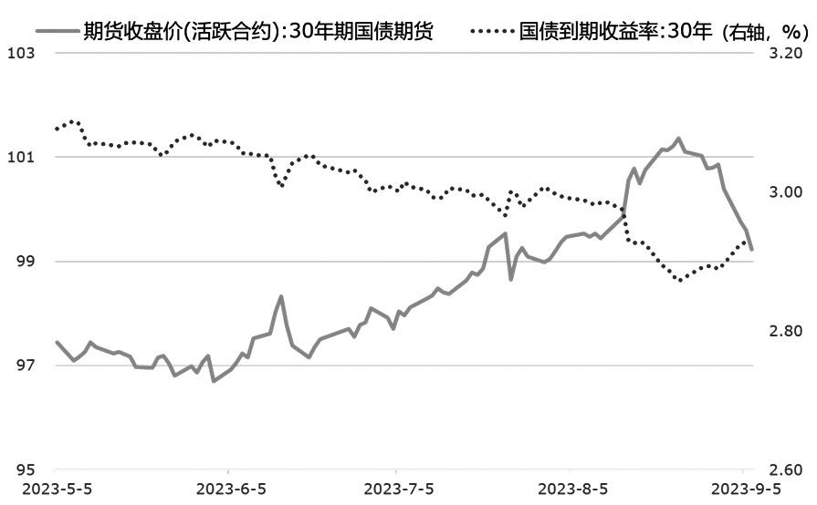 图为30年期国债期货价格及30年期国债收益率走势