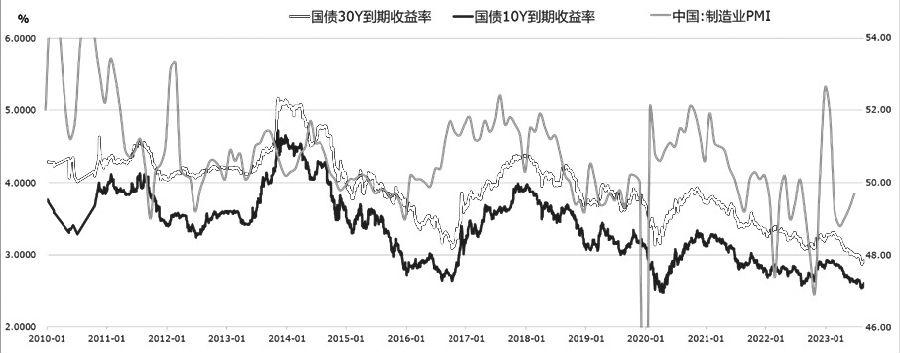 图为10年期、30年期国债收益率与PMI走势关系
