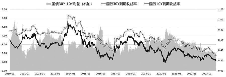 30年期和10年期国债收益率差异反映的是期限偏好溢价、流动性偏好溢价以及长期经济增长预期。通常,经济走强及流动性宽松周期,利差回升。从历史行情看,2021年以前,30年期和10年期国债利差与10年期国债收益率呈明显负相关关系,即利差随10年期国债收益率上行/下行而收窄/走扩,这是由于30年期国债收益率弹性较小,期限利差主要取决于10年期国债收益率的波动。而在2021年以后,情况发生了变化。当10年期国债收益率上行时,利差上行幅度小或相对稳定,而当10年期国债收益率下行时,利差随之下行。这是由于,10年期国债收益率受短期强预期和弱现实反复的影响,而市场对长期经济的预期较为一致,对30年期国债的增配节奏相对平稳,导致30年期国债收益率对利好因素敏感而对利空因素钝化。