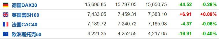 2.截至发稿,德国DAX指数跌0.28%,英国富时100指数涨0.09%,法国CAC40指数跌0.06%,欧洲斯托克50指数跌0.40%。