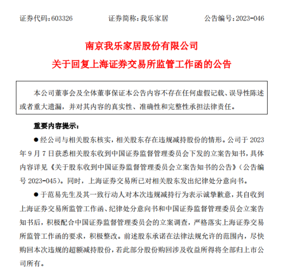 9月7日晚,我乐家居发布了上交所监管回复函,公告称于范易先生及其一致行动人对本次违规减持行为表示诚挚歉意,承诺在法律法规允许的范围内,尽快购回本次违规的超额减持股份,若此部分股份购回涉及收益所得将全部归上市公司所有。