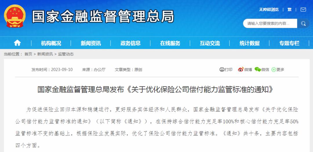 10日晚间,国家金融监督管理总局发布《关于优化保险公司偿付能力监管标准的通知》!