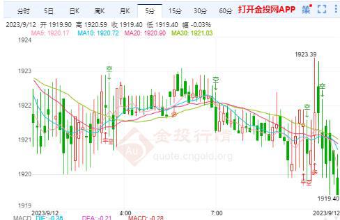周二(9月12日)本交易日黄金期货维持跌势,今日开盘报1922.39美元/盎司,最高触及1923.39美元/盎司,最低触及1919.40美元/盎司,截止发稿金价报1920.32美元/盎司,跌幅0.07%。美元指数遭遇猛烈抛售,目前交投在104.60附近,日内重挫近50点。美元走软利好金价走势。