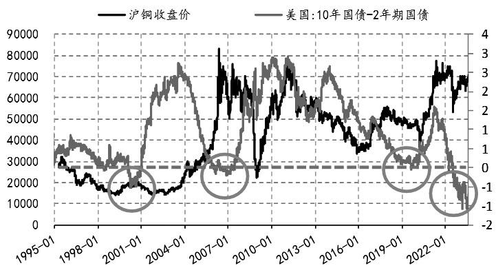 2022年上半年,美联储多次加息75个基点后,引发市场担忧预期。6月初,铜价自69000元/吨高点快速下跌至50000元/吨附近,随后进入反弹通道。然而,美债收益率7月才开始进入倒挂区间,此后一度形成深度倒挂状态,引发市场担忧。从时间节点来看,美债收益率倒挂的开始时间点是在铜价上一轮下跌之后,也就意味着美国经济衰退的实质性危机尚未兑现在盘面上。