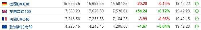 2.截至发稿,德国DAX指数跌0.13%,英国富时100指数涨0.72%,法国CAC40指数跌0.06%,欧洲斯托克50指数涨0.04%。
