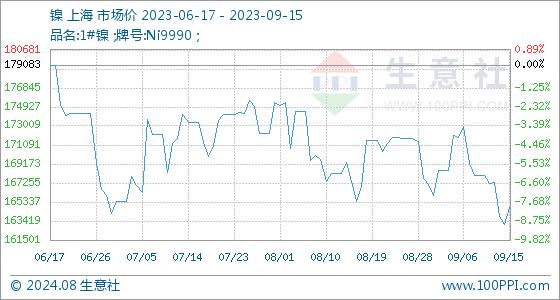 9月15日,生意社镍基准价为163100.00元/吨,与本月初(166000.00元/吨)相比,下降了-1.75%。
