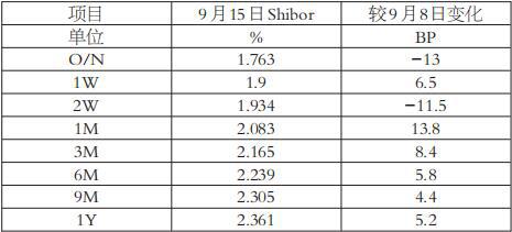 上周,国内市场利率呈现短降长升的态势。一方面,受央行大量逆回购和月中缴税、缴款高峰结束的影响,短期利率回落;另一方面,政府前期推出的政策效果开始显现,中长期利率稳中有升。截至9月15日,上海银行间同业拆放利率(Shibor)隔夜、2周期分别报收于1.763%、1.934%,较9月8日分别下降13、11.5个基点;1周期、1月期、3月期、6月期、9月期、1年期分别报收于1.9%、2.083%、2.165%、2.239%、2.305%、2.361%,较9月8日分别上升6.5、13.8、8.4、5.8、4.4、5.2个基点。