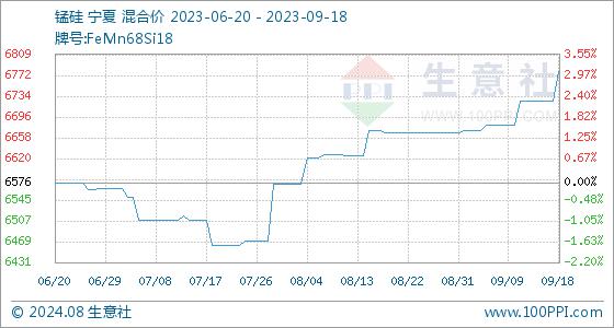 9月18日,生意社锰硅基准价为6725.00元/吨,与本月初(6666.67元/吨)相比,上涨了0.87%。