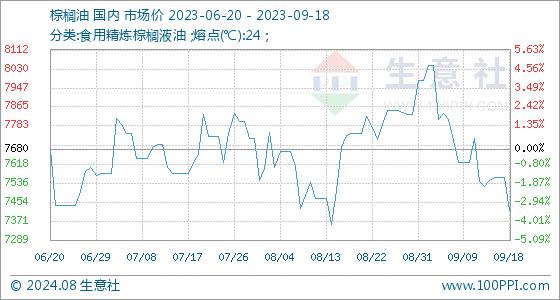 9月18日,生意社棕榈油基准价为7560.00元/吨,与本月初(7980.00元/吨)相比,下降了-5.26%。
