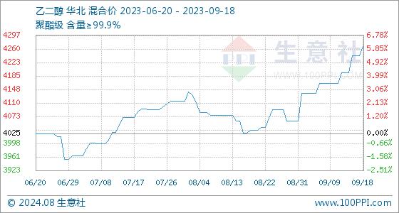 9月18日,生意社乙二醇基准价为4241.67元/吨,与本月初(4060.00元/吨)相比,上涨了4.47%。