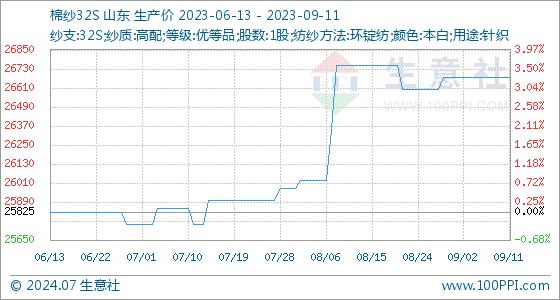 9月11日,生意社棉纱32S基准价为26675.00元/吨,与本月初持平。